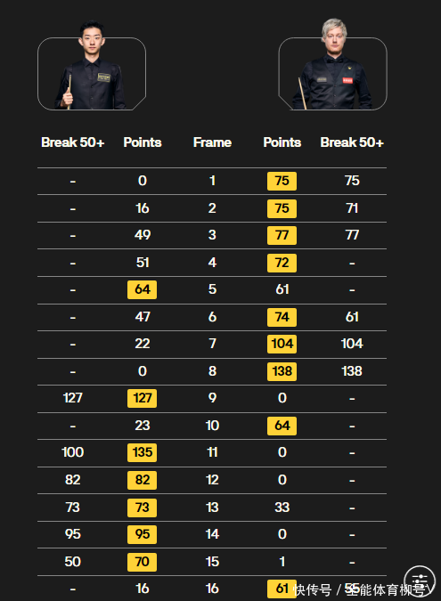 这场决赛的第一阶段,还是罗伯逊的实力和经验起到作用。罗伯逊开局之后进入状态非常快,前五局取得4-0的连续优势。第一阶段轰出138分、104分和4杆50+,7-1遥遥领先。