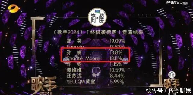 各选手的得票率也公布了。其中,孙楠得票13.8%,香缇莫得票13.11%, 而这两个数字引发了网友对排名的质疑。不少网友认为13.11%大于13.8%, 因此香缇莫的得票率比孙楠高,其排名也应该高。